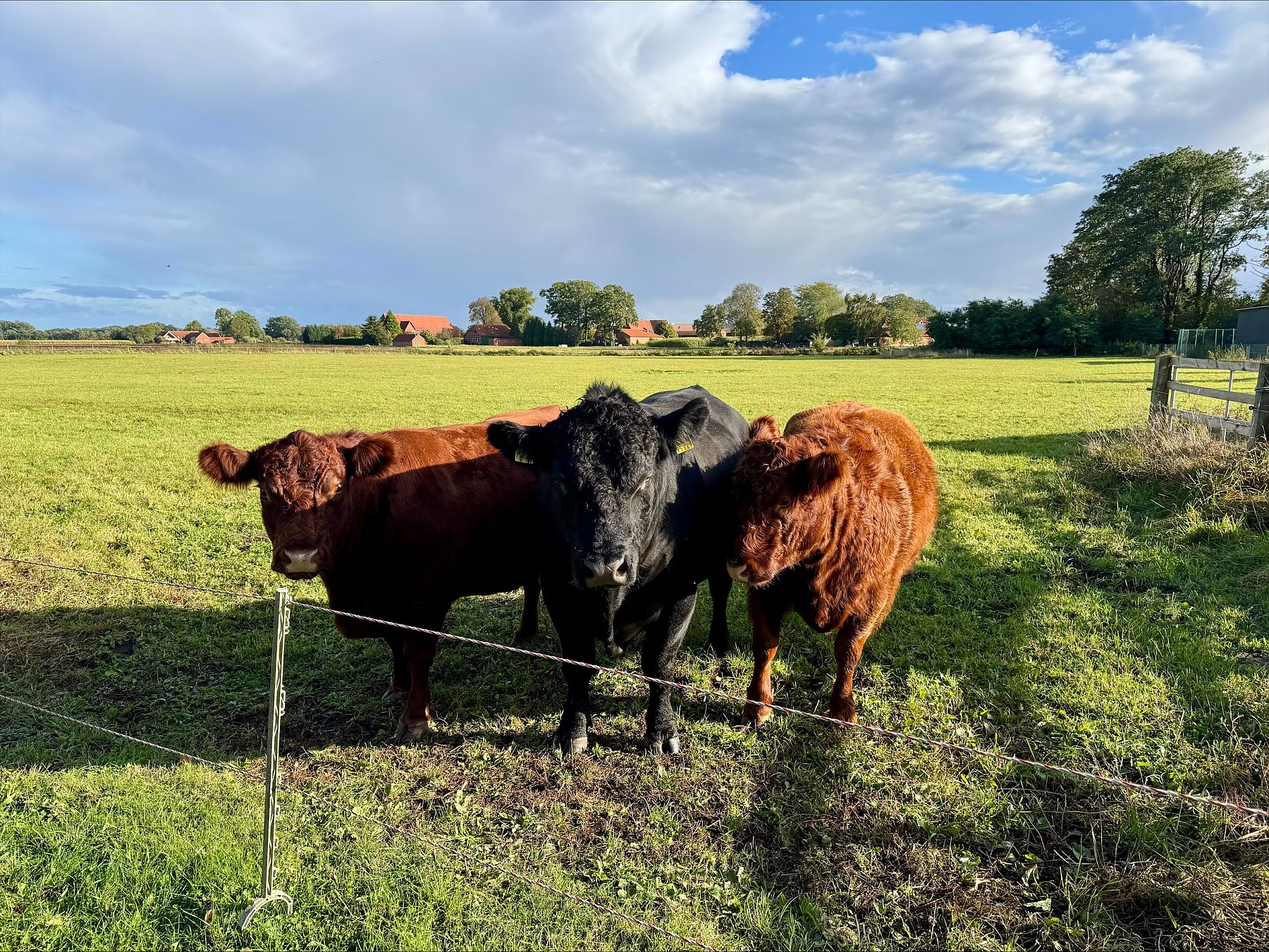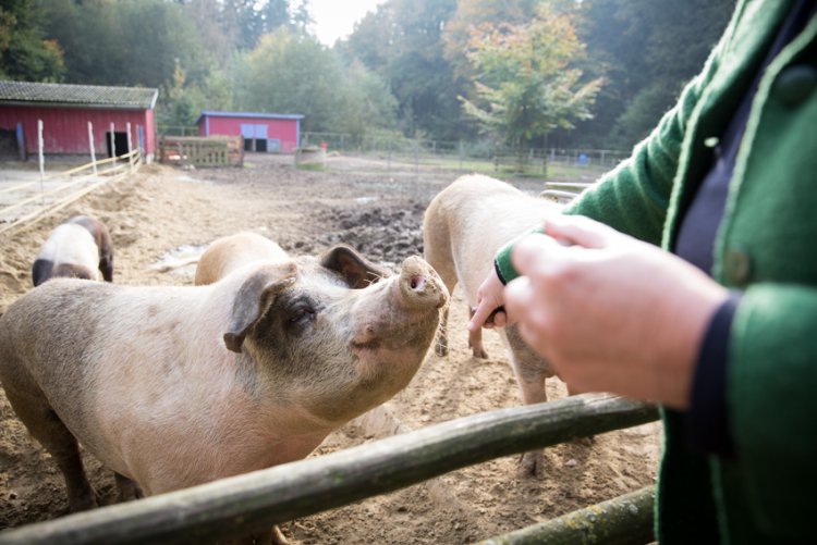 Zum Westflügel gehören etliche Tiere: die beiden großen Hunde unserer Geschäftsführerin, mehrere Katzen, aber auch verschiedene Nutztiere. Neben dem Haupthaus scharren Hühner in ihrem Gehege, gleich nebenan residieren mehrere stattliche Schweine der alten Rasse Durok.